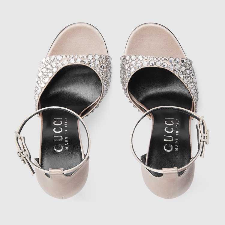 Style 749832 KND90 9642A fun and whimsical women's sandal, reflecting the latest Gucci collection. This variation appears in silver satin, complete with an ankle closure and a precious Double G detail. Multi-sized crystal define the elegant silhouette of the style.