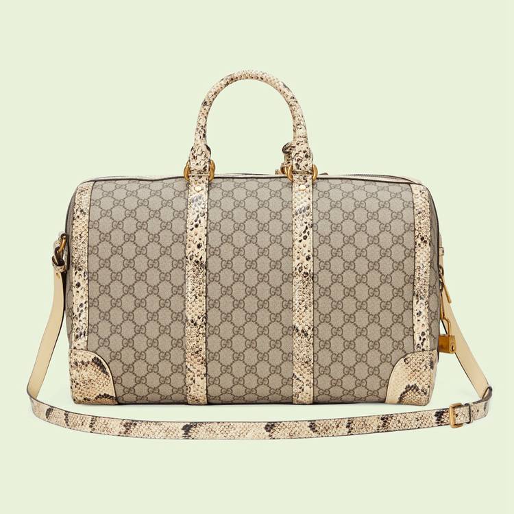 Style 710860 FAALG 8355Dating back to the 17th Century, the humble duffle bag is known for its versatility and practicality. This timeless travel accessory stays true to its original function while reimagined in precious materials for Gucci Love Parade. Here a natural python trim adds a luxurious final touch to the beige and ebony GG Supreme canvas.