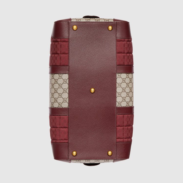 Style 724642 FAB9Y 6042Gucci's travel accessories push the boundaries of design, constantly reimagining signature travel pieces in unique ways. This duffle bag blends the historic GG Supreme canvas with a burgundy quilted mini GG canvas, resulting in a modern accessory with vintage appeal.