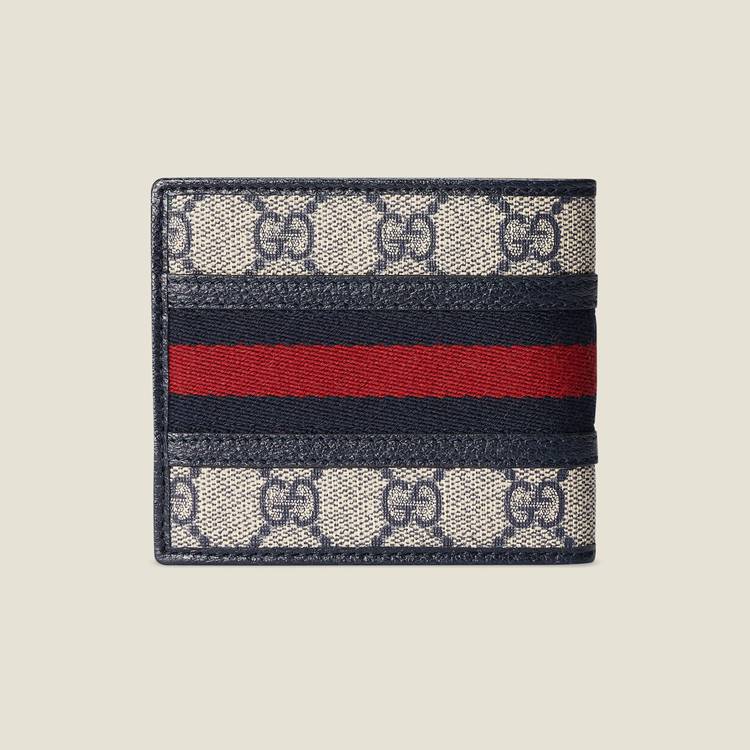 Style 597606 96IWN 4076Mirroring the material's historic origins, GG Supreme is introduced in a timeless mix of blue and beige for Gucci Love Parade. The canvas has come to the front of each collection decade after decade to become a hallmark of the House. Here, the classic palette defines this wallet from the world of Ophidia, completed by the Web stripe in blue and red.