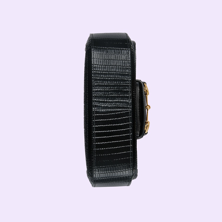 Style 675801 FABCP 1161Presented in precious black moire fabric with GG crystals and black lizard trim, the structured shape and clean lines of the Gucci Horsebit 1955 highlight the collection's signature gold-toned hardware. Part of Gucci’s genetic code, the double ring and bar design has been established as one of the most distinctive elements among the House symbols borrowed from the equestrian world. A delicate chain strap with monogram details adds a refined note to the style.