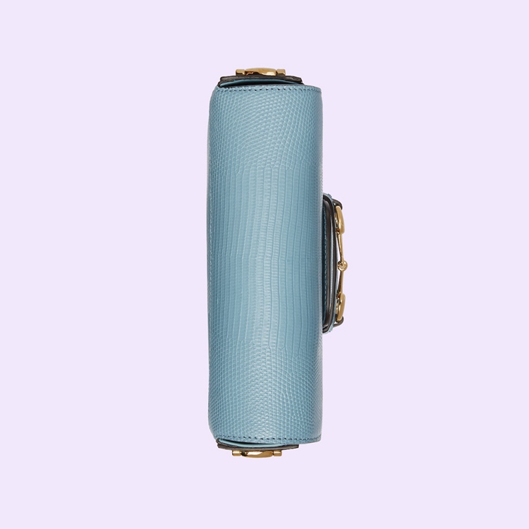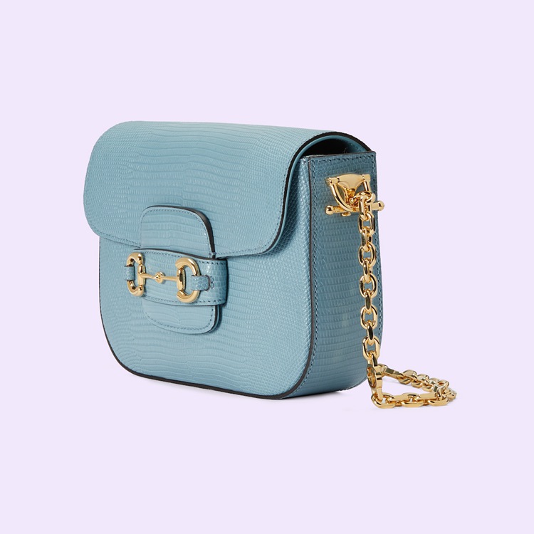 Style 675801 LUZ0G 4514Presented in precious light blue lizard, the structured shape and clean lines of the Gucci Horsebit 1955 highlight the collection's signature gold-toned hardware. Part of Gucci’s genetic code, the double ring and bar design has been established as one of the most distinctive elements among the House symbols borrowed from the equestrian world. A delicate chain strap with monogram details adds a refined note to the style.