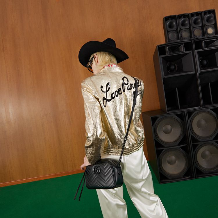 Style 447632 DTDHV 1000The small GG Marmont chain shoulder bag has a softly structured shape and a zip top closure with the Double G hardware. The chain shoulder strap has a leather shoulder detail. Made in matelasse leather with a chevron design. The emblematic accessory is introduced with tonal hardware for Gucci Love Parade.