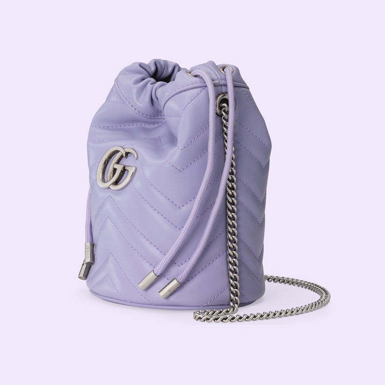 Style 575163 DTDRP 5306The GG Marmont mini bucket bag is crafted from quilted matelasse leather in a shade of lilac that mirrors the pastel hues that add a soft yet vibrant note of color to the latest collection. The shape is defined by the line's emblematic Double G hardware—an archival symbol from the '70s that has become a hallmark of the House. Featuring a chain strap and drawstring closure the versatile design can also be worn as a cross body bag.