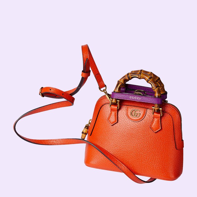 Style 715775 DJ24G 7564Combining recognizable elements of the House, the mini tote bag is defined by its bamboo handles and Double G hardware. Crafted from orange leather, the accessory is further accentuated by two bands, a playful reference to the bands used to keep handles in shape.