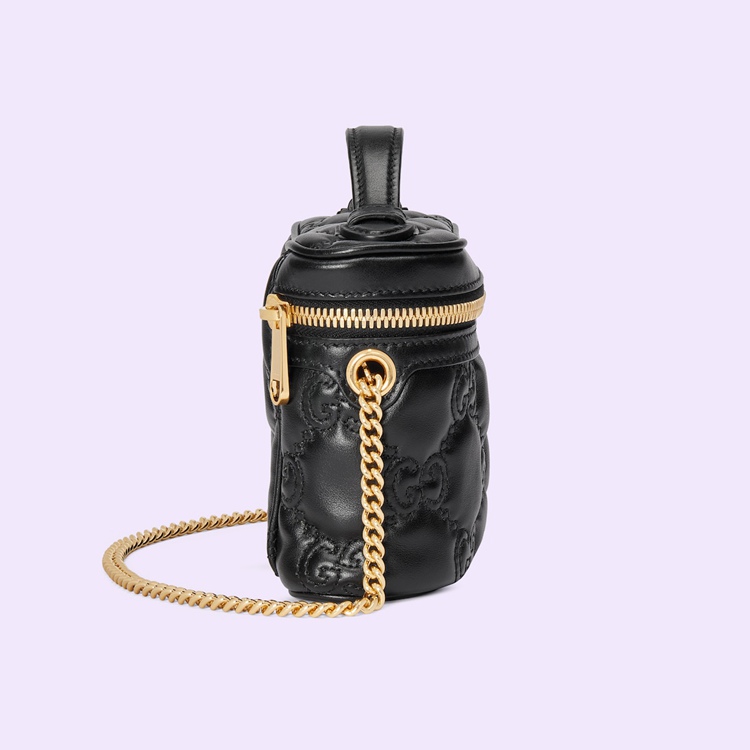 Style 723770 UM8IG 1000Matelasse leather is a signature material of the House, thanks to its super soft finish. The textured geometric motif defines a selection of small leather accessories, including this black top handle mini bag. The Double G hardware decorates the front, continuing the logo feel of the design.