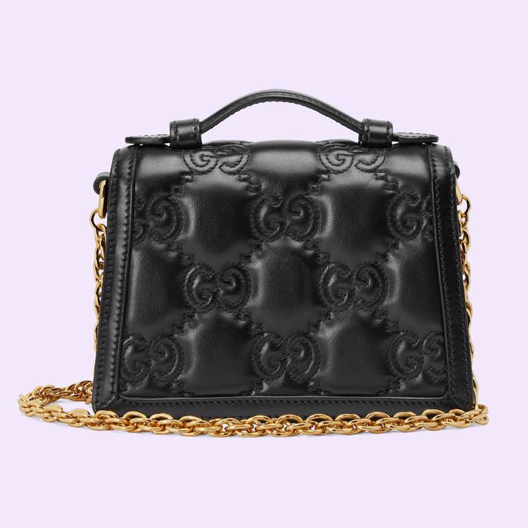 Style 724499 UM8HG 1046Matelasse leather continues to innovate in unique ways each season. With a super soft finish, the signature material is reimagined with a textured geometric motif as a part of the handbag collection. The design presents a contemporary approach to the '90s logo trend, here it defines a black leather top handle bag.