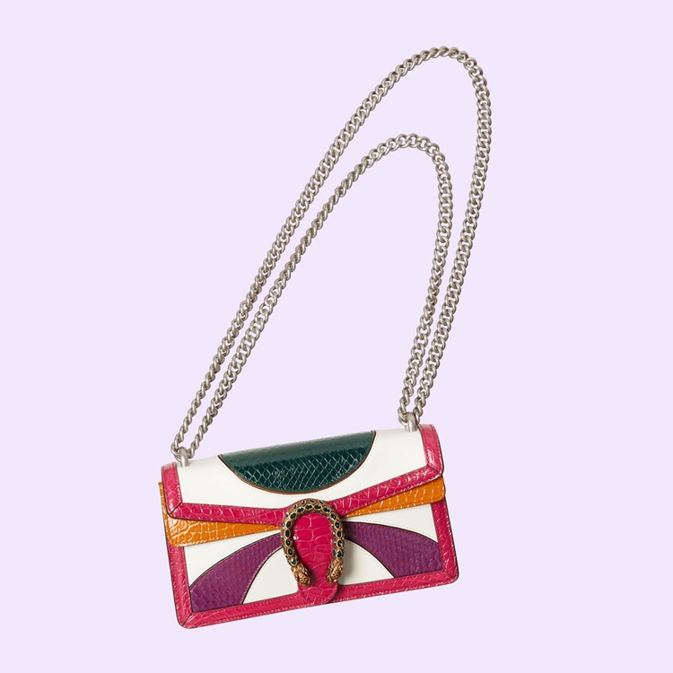 Style 499623 AABPV 9085Gucci Nojum takes its name from the Arabic word 'Nojum', meaning 'stars' in English. The line presents an elegant range of signature styles designed in celebration of beautiful night skies, with metallics, sparkling details and delicate color palettes. Here, the Dionysus shoulder bag is presented in white leather with vibrant orange, purple and green crocodile panels.
