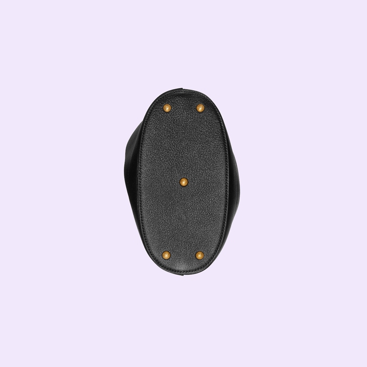 Style 724667 UAAAY 1092Combining recognizable elements of the House, the mini bucket bag is defined by its bamboo handles and Double G hardware. Crafted from black leather, the accessory is further accentuated by a decorative leather belt, a playful reference to the bands used to keep handles in shape.