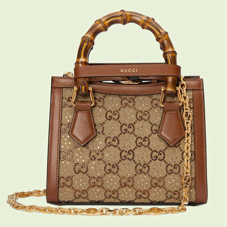 Style 707449 21HRG 2687Marking the House’s first in-person fashion show since February 2020, Gucci Love Parade unfolded along Los Angeles' walk of fame. Inspired by the timeless nature of old-Hollywood glamour, the collection presents contemporary takes on traditional pieces. This Gucci Diana mini tote bag is presented in camel and ebony GG canvas with crystal - a refined addition to the emblematic silhouette.