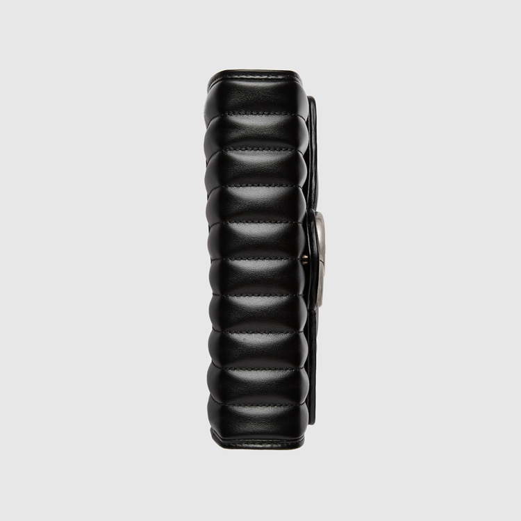 Style 474575 DTD5N 1000The Gucci Aria collection is an exploration of the House's most emblematic codes and symbols. The GG Marmont is synonymous with its matelasse leather and monogram hardware. Here, the mini shoulder bag is reimagined with a new geometric take on its signature finish that combines vertical and diagonal motifs in black.