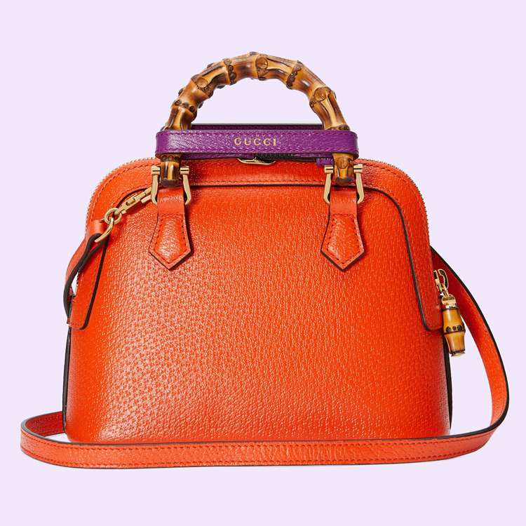 Style 715775 DJ24G 7564Combining recognizable elements of the House, the mini tote bag is defined by its bamboo handles and Double G hardware. Crafted from orange leather, the accessory is further accentuated by two bands, a playful reference to the bands used to keep handles in shape.