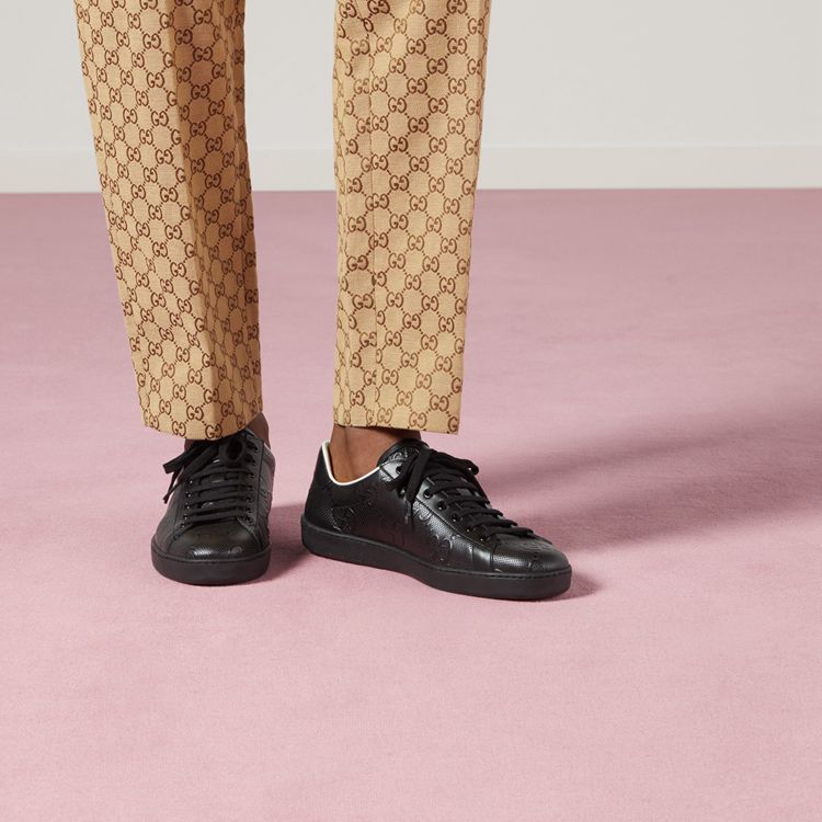 Style 625787 1XK10 1000A new introduction of the GG motif presented within the Pre-Fall 2020 collection plays with texture, embossing the House emblem onto a black perforated leather base. Noted for its softness and slightly shiny finish, the GG leather defines the emblematic Ace sneaker.