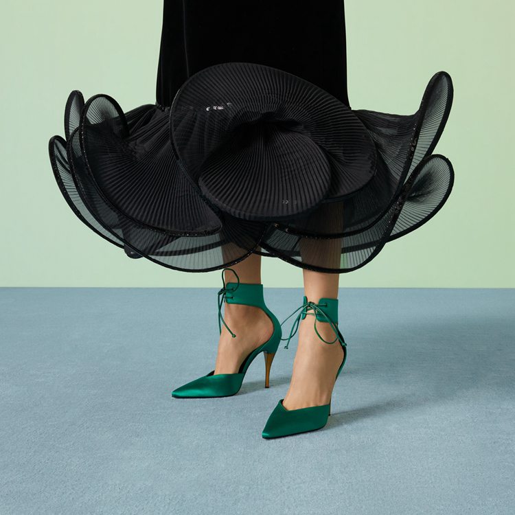 Style 752966 F3C20 3746Retro shapes and metallic materials frame designs with an early 2000s aesthetic. This statement pump is presented in green satin, while an ankle strap with lace-up closure enhances the elegant silhouette of the style.