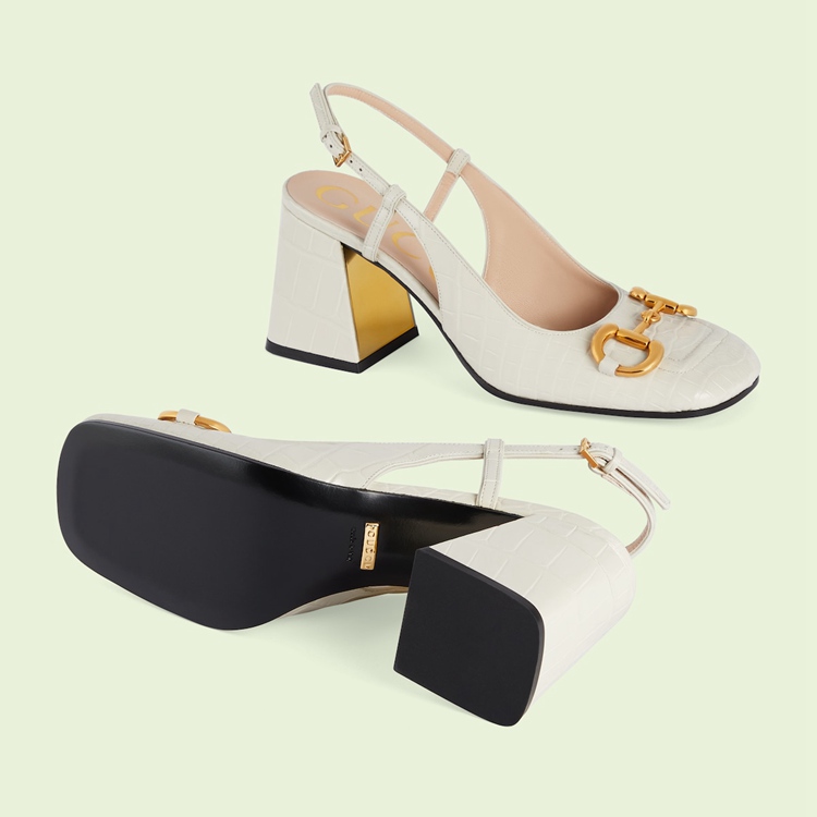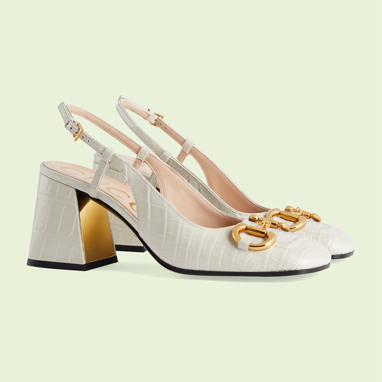 Style 708951 E5BF0 9022Each part of the House's history comes together to shape the latest collections as symbolic details are reinterpreted with a contemporary spirit. An emblem of Gucci's equestrian origins, the Horsebit defines this pair of slingback pumps. The shoe is presented in precious white crocodile with a square-toe and sculpted heel.
