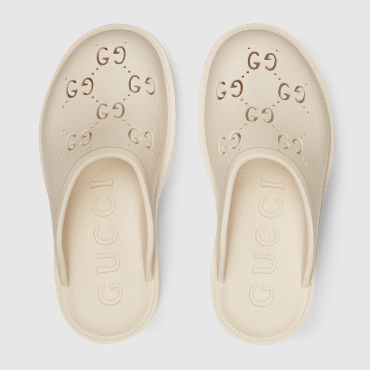 Style 663577 JFB00 9022First used in the 1970s, the GG logo was an evolution of the original Gucci rhombi design from the 1930s, and from then it's been an established symbol of Gucci's heritage that evolves each season. Here, the monogram appears as a cut out motif atop these white rubber sandals.